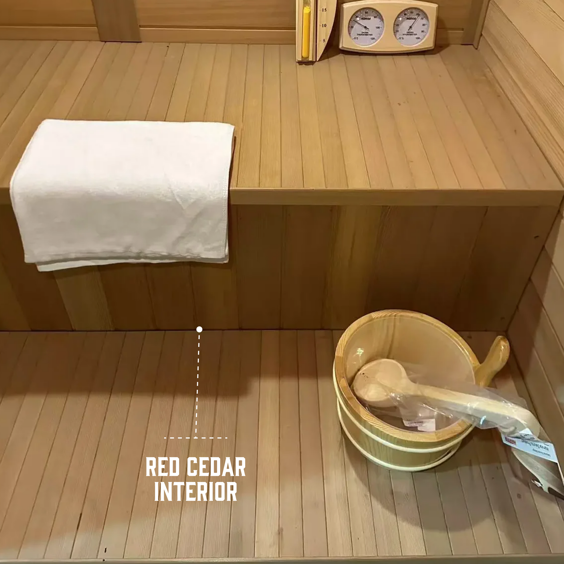 Rodeo Wellness saunas are constructed using Canadian Hemlock or Red Cedar, depending on the model. Wood type, grain pattern, color, and finish may vary due to natural material characteristics and manufacturing processes. Material specifications shown on product pages are provided for reference only and may vary slightly from unit to unit. The woods used are selected for durability and heat retention. Materials are manufactured to meet applicable safety standards and are designed for use in sauna environments.
